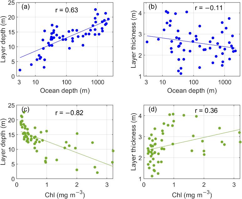 文中结合海洋混合层深度、叶绿素浓度、海水深度等,分析了薄层特征与环境因素的相关性,并得到了较高的相关性(如图4)。并从原位生长、涡旋等机制出发,对探测区域内的薄层的形成进行了解释。光照在海水表面丰富,而营养物质一般沉积在深水中,并受到洋流等因素的影响,当两者在一定深度范围内同时满足浮游植物的生长时,就可能形成薄层。