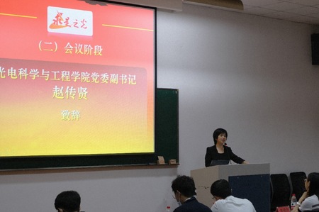接下来,光电学院第三十四届研究生会主席团成员潘玉瑶作了大会筹备工作报告,并报请各位代表予以审议。接着,由光电学院党委副书记赵传贤老师做了开幕致辞,赵老师对第三十四届研究生会主席团以及研会所有成员在过去的一年为学院做出的贡献表示了充分肯定,并展望了学院未来学生工作的进行,对新一届研究生会主席团及成员寄予了厚望。