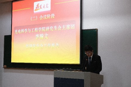 最后,光电学院第三十四届研究生会主席团成员李瀚文同学向各位代表作了研究生会工作报告,对光电学院第三十四届研会的工作做了整体回顾,并代表本届研究生会向下一届研究生会主席团提出了几点期望。全体代表无异议地通过了本次研会工作报告。