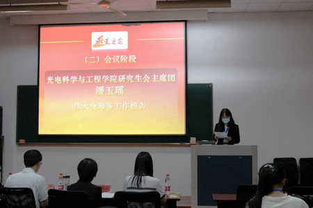 大会由光电学院第三十四届研究生会主席团成员端木一婷主持,议程包括准备阶段、会议阶段、审议阶段、选举阶段。会前准备阶段,工作人员清点了与会代表人数,并由主持人宣读会议须知。会议阶段,首先由主持人介绍与会嘉宾,并全体起立奏唱国歌。