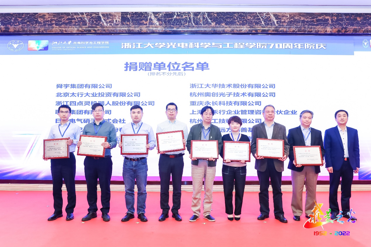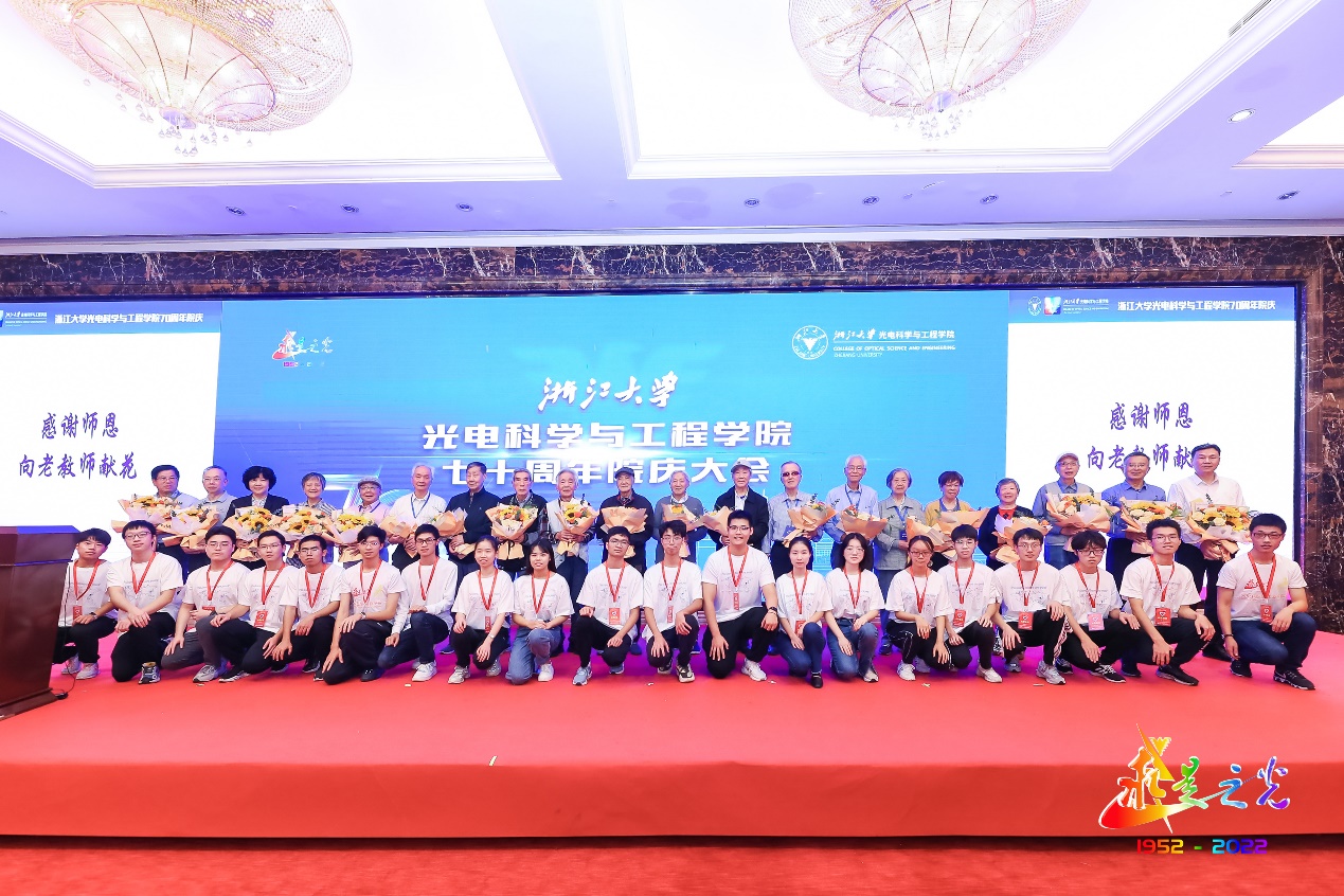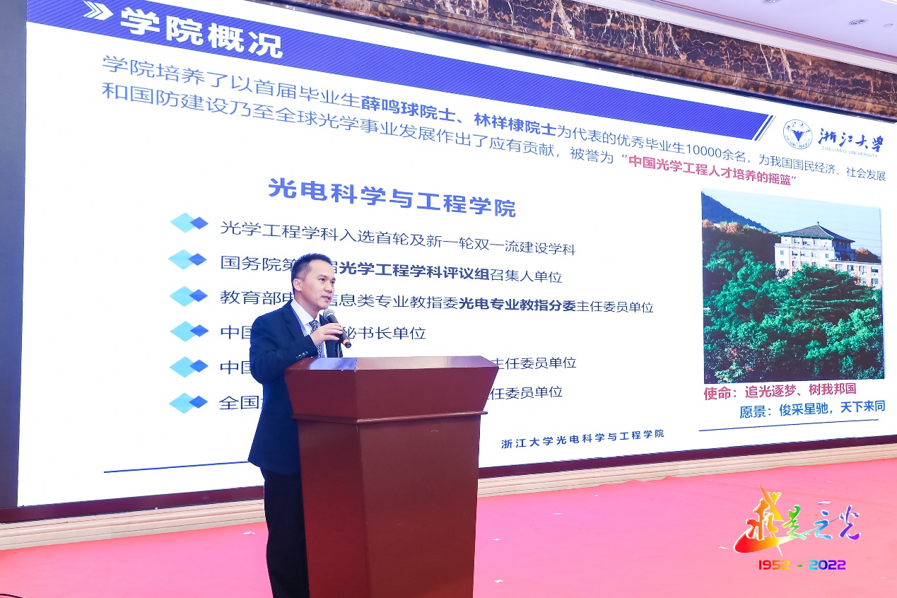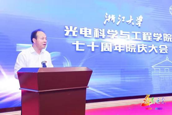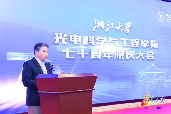 2022年11月12日,浙江大学光电科学与工程学院70周年院庆大会在浙江宾馆隆重举行。浙江大学党委副书记黄翔峰,中国科学院院士、现代光学仪器国家重点实验室学术委员会主任朱诗尧,清华大学精密仪器系学术委员会主任孙洪波,嘉兴市秀洲区副区长张镁利,舜宇光学科技(集团)有限公司创始人、名誉董事长王文鉴,舜宇集团董事长叶辽宁,浙江水晶光电科技有限公司董事长林敏,利安科技股份有限公司总裁邱翌, 77级校友、原宁波大学校长聂秋华等200余位嘉宾、校友、师生出席大会。因疫情防控原因,会议采取线上线下相结合的形式, 约有6500位师生及院友线上“云端”相聚,共庆华诞,共襄盛举。