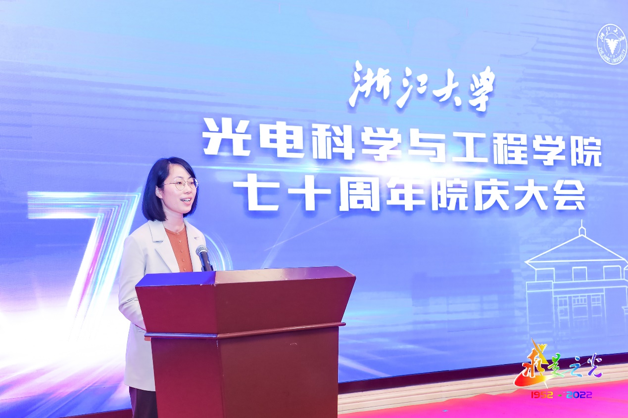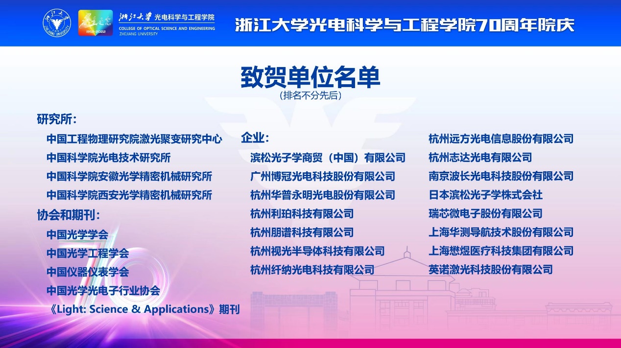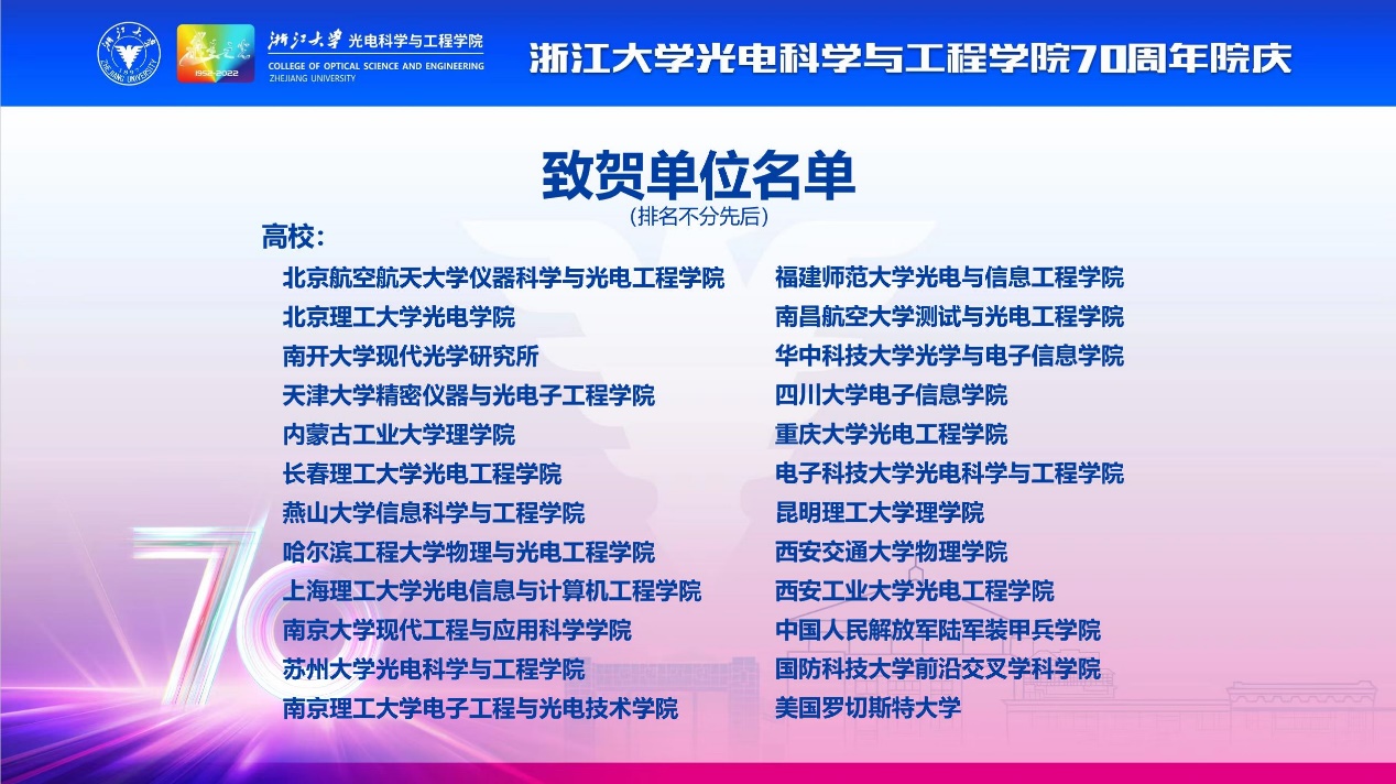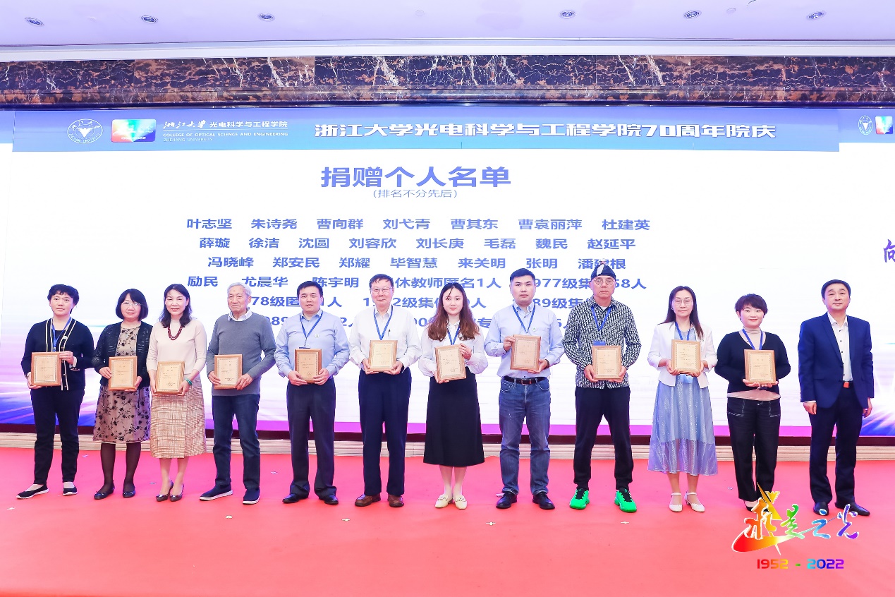2022年11月12日,浙江大学光电科学与工程学院70周年院庆大会在浙江宾馆隆重举行。浙江大学党委副书记黄翔峰,中国科学院院士、现代光学仪器国家重点实验室学术委员会主任朱诗尧,清华大学精密仪器系学术委员会主任孙洪波,嘉兴市秀洲区副区长张镁利,舜宇光学科技(集团)有限公司创始人、名誉董事长王文鉴,舜宇集团董事长叶辽宁,浙江水晶光电科技有限公司董事长林敏,利安科技股份有限公司总裁邱翌, 77级校友、原宁波大学校长聂秋华等200余位嘉宾、校友、师生出席大会。因疫情防控原因,会议采取线上线下相结合的形式, 约有6500位师生及院友线上“云端”相聚,共庆华诞,共襄盛举。