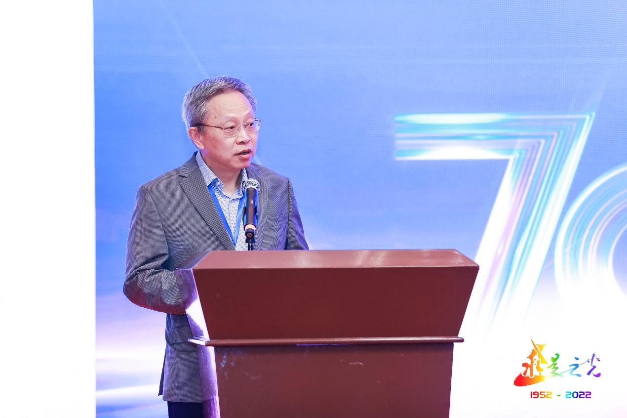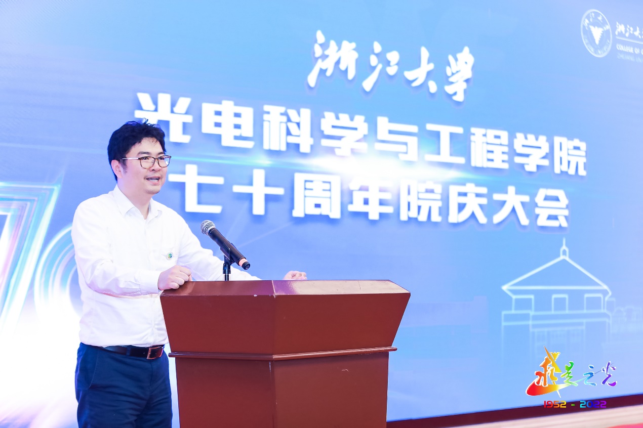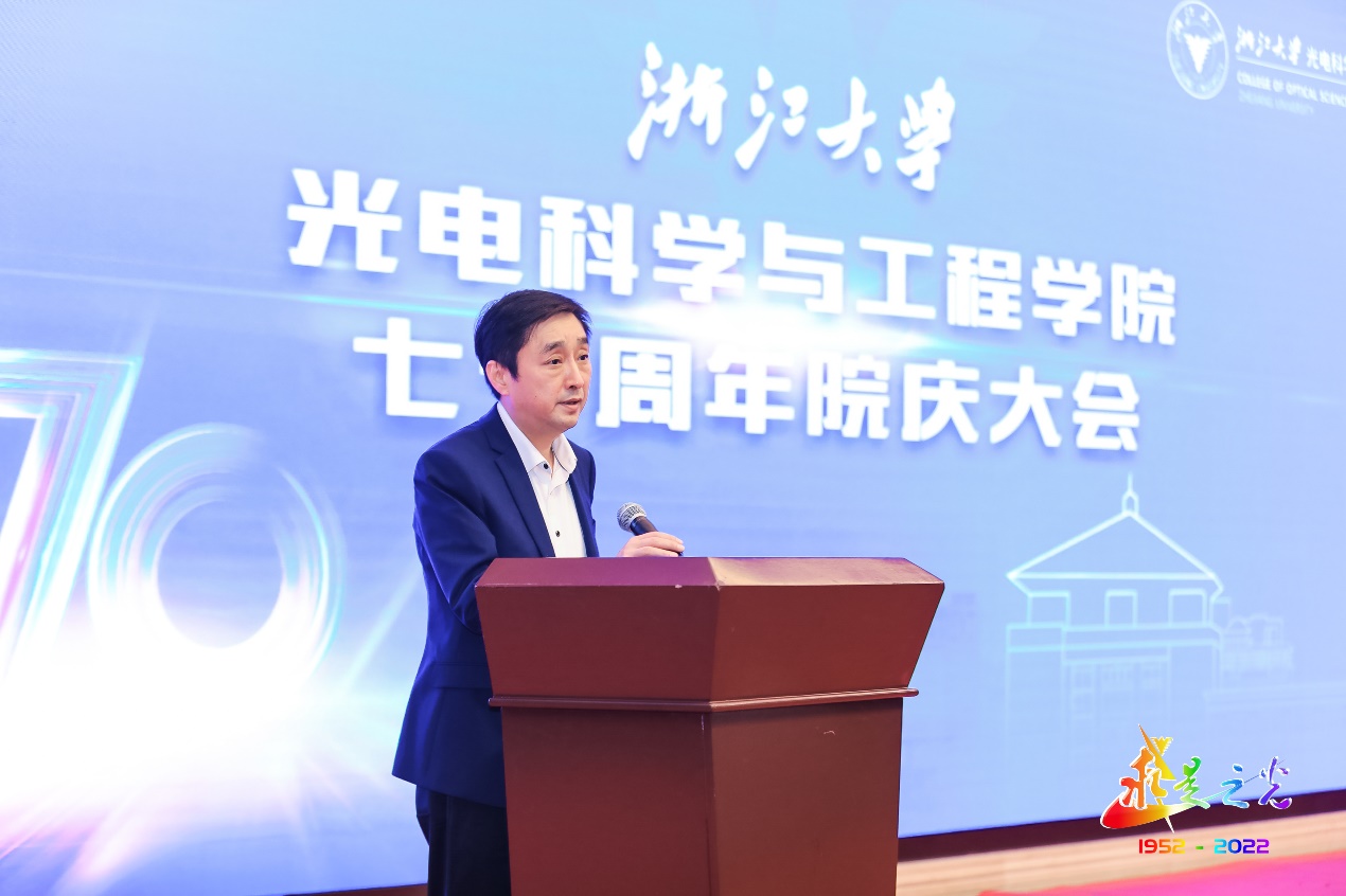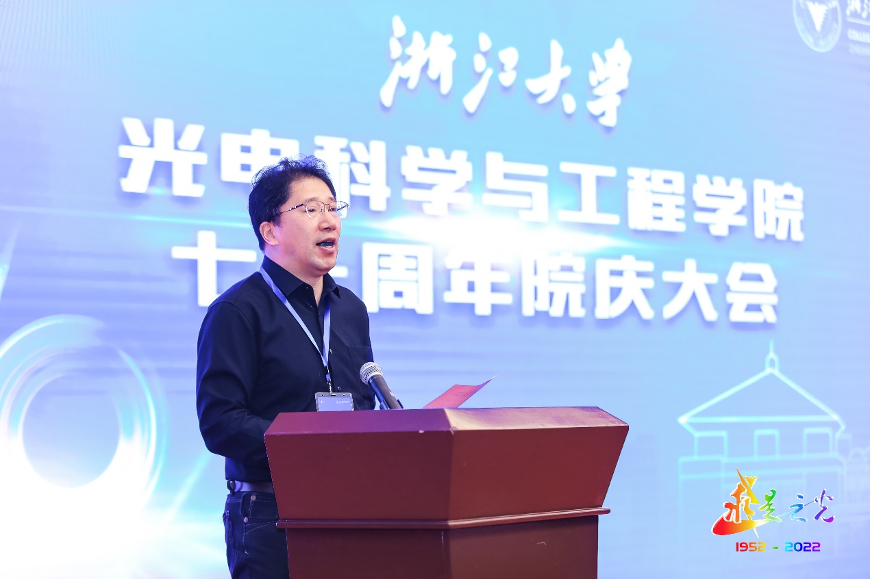 大会伊始,校党委副书记黄翔峰首先致辞。他代表学校向光电学院全体师生、离退休教师和海内外校友表示了热烈的祝贺,向长期以来关心和支持学院发展的社会各界人士表示衷心的感谢。他指出,光电学院在新中国的朝阳中诞生、在艰难困苦中求索、在改革开放中发展、在新时代中迈向一流,走出了一条“顶天立地”的世界顶尖学科追寻之路,绘就了一幅熠熠生辉的历史画卷。浙大光电的70年,全面展现了立德树人、铸魂育人的初心使命,生动诠释了爱国奉献、勇攀高峰的责任担当,充分彰显了改革创新、锐意进取的奋斗情怀。他强调,党的二十大报告明确了教育、科技、人才是全面建设社会主义现代化国家的基础性、战略性支撑,希望学院要扎根中国大地,在求是创新中全面落实立德树人根本任务,要勇于追求卓越,在更高远的使命引领下建设一流学科,要坚持海纳百川,以共同的精神文化凝聚起面向未来的奋斗力量。