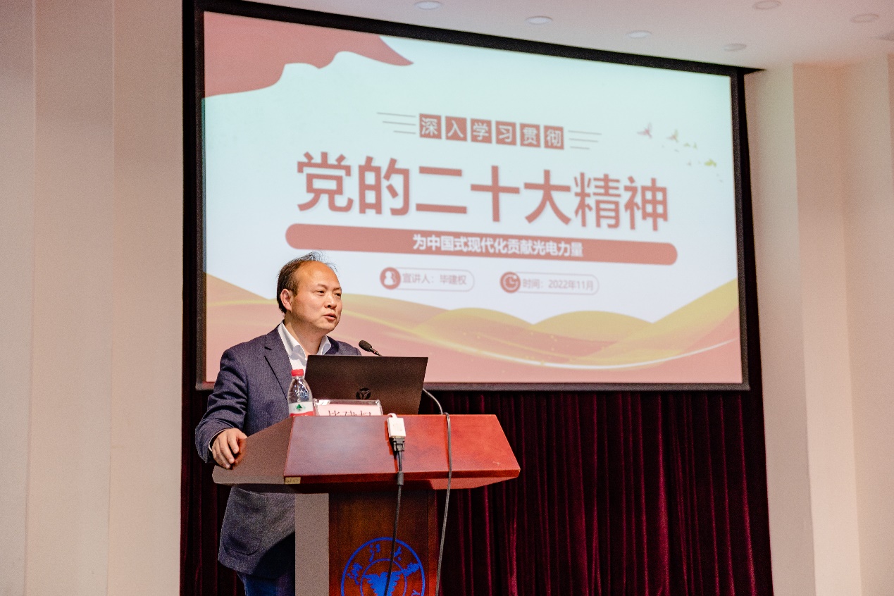 会上,毕建权以“学习贯彻党的二十大精神,为中国式现代化贡献光电力量”为题,从党的二十大的基本情况、二十大报告主要内容、有关学习宣传贯彻党的二十大精神的通知要求以及为中国式现代化贡献光电力量等4个方面,重点围绕二十大报告蕴含的重要思想、重要观点、重大战略、重大举措及其重大意义,对党的二十大精神进行了详细解读和系统阐述。