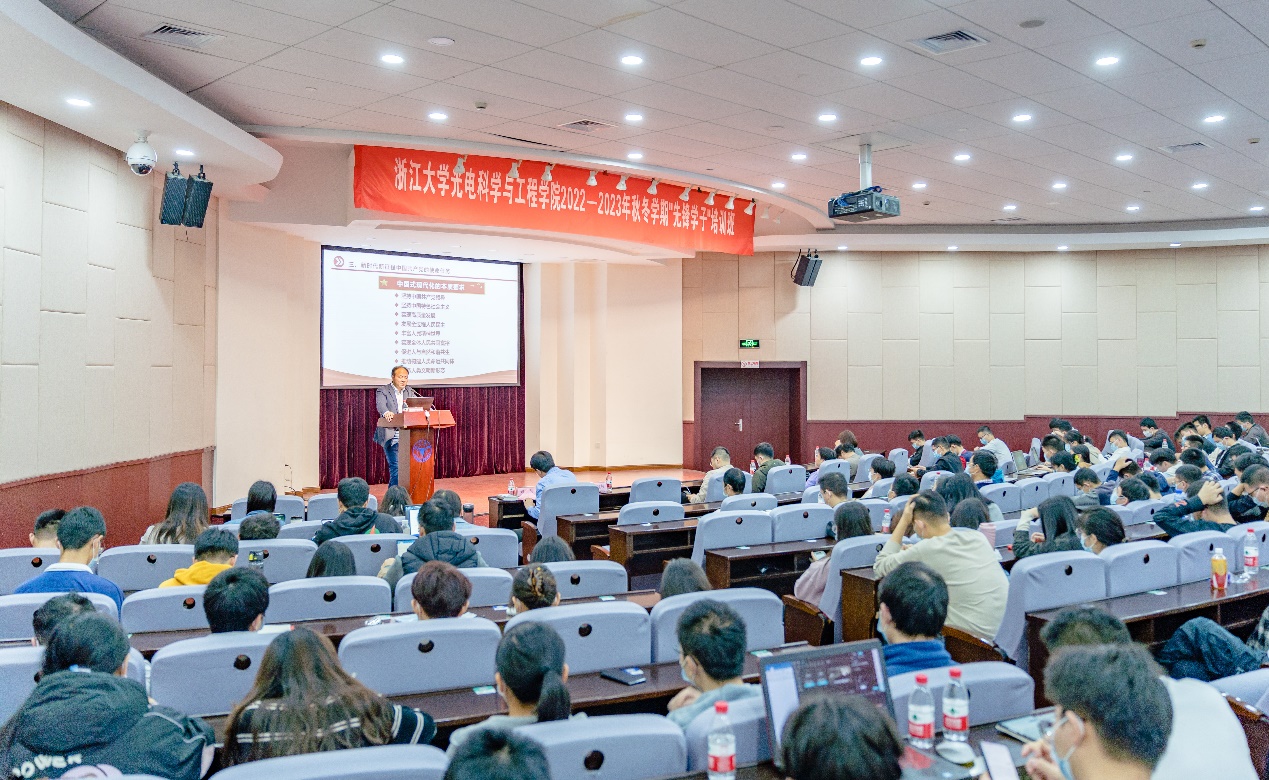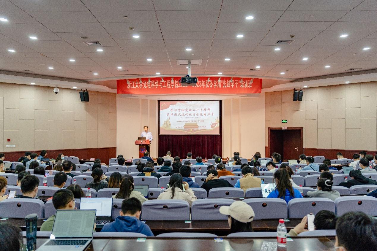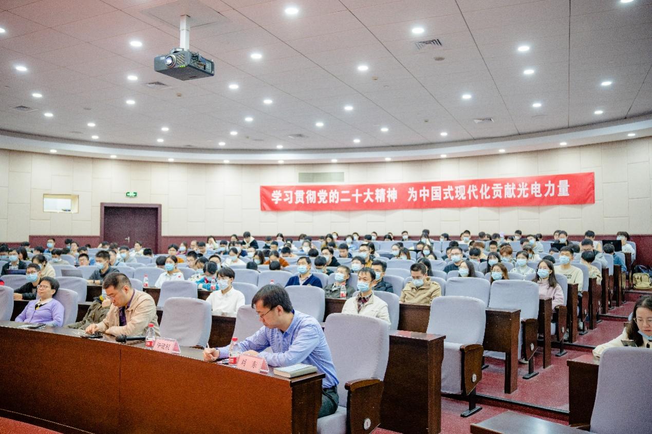 2022年11月25日,光电学院学习党的二十大精神专题宣讲会暨“先锋学子”培训班在玉泉校区邵科馆117举行,学校党的二十大精神宣讲团成员、光电学院党委书记毕建权作专题学习辅导报告。报告会由光电学院党委委员、副院长刘东主持,学院师生党员代表180余人参加报告会。
