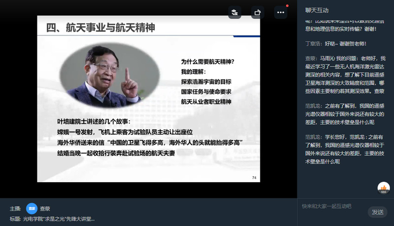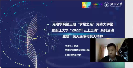 2022年5月20日,光电学院第三期“求是之光”先锋大讲堂暨浙江大学“2022年云上走访”系列活动在线上召开。讲座邀请到光电学院09级本科生院友、中国航天科技集团五院遥感卫星有效载荷主管设计师贺涛进行题为“航天遥感与航天精神”专题讲座,全校师生300余人在线观看。讲座由学院党委副书记赵传贤老师主持。