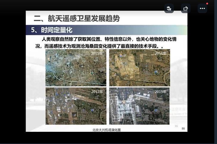 随后,贺涛院友从感知的定性探测转换到数据的定量反演,从几何定量遥感、辐射定量遥感、时间定量遥感三个方面介绍了航天遥感卫星的发展趋势,结合遥感卫星在我们生活中的应用作了生动的介绍。