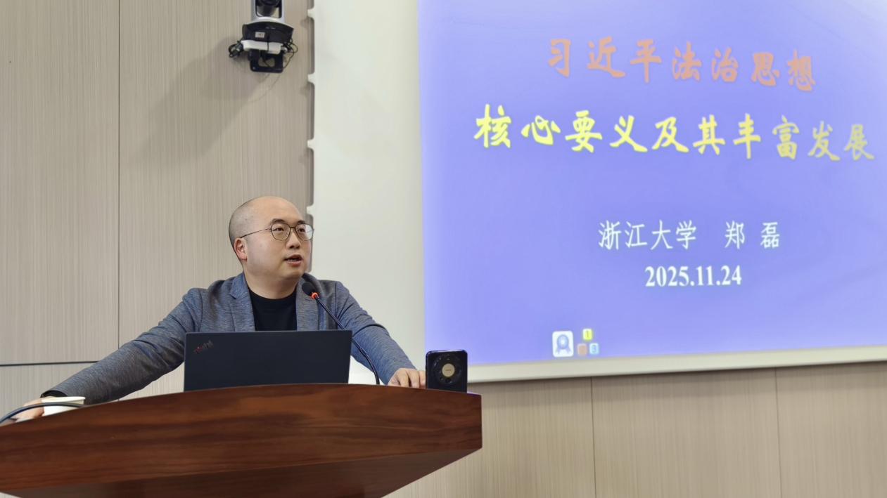 习近平法治思想正式提出五周年之际,辅导报告以学习近期习近平对全面依法治国工作作出重要指示开篇,郑磊教授向老师们系统阐释了理解和把握习近平法治思想应具备三个方面的“学‘习’方法”——体系感、实践感与历史感,强调要全面把握“四个全面”战略布局中全面依法治国的系统性、实践性与历史脉络;进而围绕“政治方向论”“战略布局论”“重点任务论”“重要保障论”四个部分,深入解读了习近平法治思想“十二个坚持”的核心内容,尤其梳理解读了五年来习近平法治思想的丰富发展。同时,郑教授结合高校工作实际,指出要将法治思维贯穿于办学治院、教书育人、科研创新全过程,在法治轨道上推进学院治理体系和治理能力现代化。