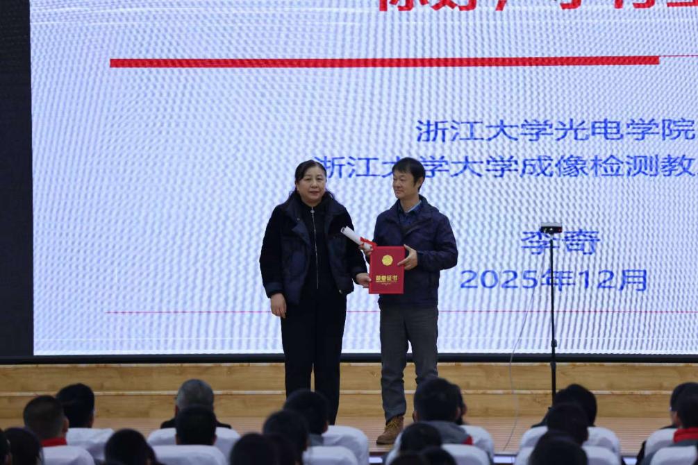 活动当天,青冈实验中学报告厅内座无虚席,同学们共同观看了浙江大学光电学院的宣传片《与光同行》。青冈实验中学校长贾淑华、副校长李立杰出席活动,李立杰代表学校致欢迎辞,贾淑华向李奇颁发“青冈实验中学德育导师”聘书,体现了学校“科教融合、德育为先”的育人理念。