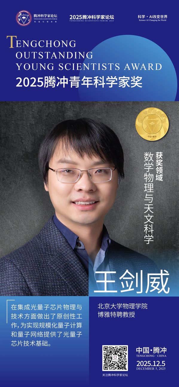 近日,2025腾冲青年科学家论坛在保山市腾冲市举行。论坛颁奖典礼上正式揭晓了首届“腾冲青年科学家奖”。浙江大学光电科学与工程学院院友王剑威教授获此殊荣。