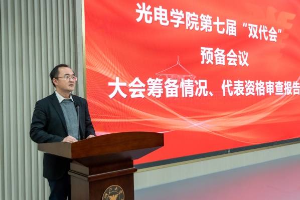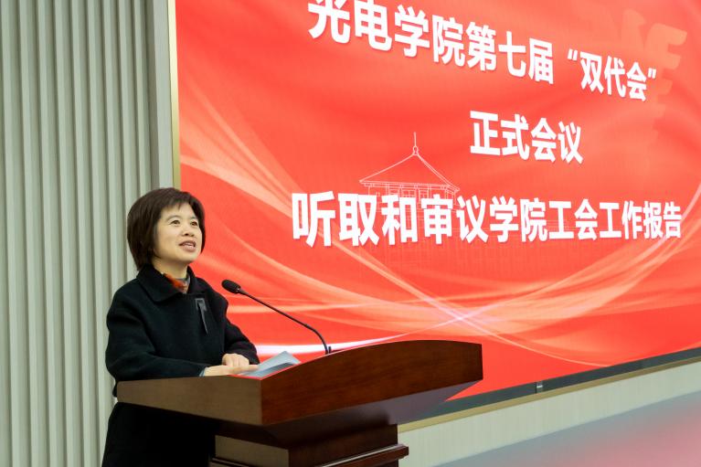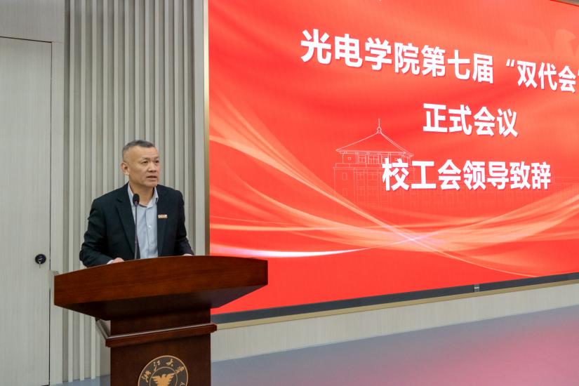 大会在庄严的国歌声中,大会正式拉开序幕。校工会副主席李民致辞,他对在致辞中向大会的召开表示热烈祝贺,并向长期奋战在坚守教学科研一线、致力于推动光学工程学科发展、服务国家重大战略需求的全院教职工致以崇高敬意。他充分肯定了光电学院在党的建设、人才培养、学科发展、社会服务等方面中取得的突出成绩,尤其是学院于2017年和2022年先后入选首轮及新一轮国家 “双一流” 建设学科,2025年更跻身U.S.News世界大学光学学科排名全球第一。,同时肯定了并对学院工会在榜样引领、民主管理、权益保障维护、凝聚活力凝聚等四个方面发挥的积极作用给予高度评价。取得的突出成绩,面向未来,李民他对学院工会未来工作提出三点希期望:一是高举旗帜、把握方向,在强化思想引领上彰显更高站位;二是围绕中心、服务大局,在助推学院卓越发展上展现更强担当;三是植根职工、精准服务,在共建共享美好家园上体现更暖温度。他勉励全体教职工传承浙江大学大“求是创新”精神,勇立潮头、携手前行,为学校浙江大学迈向世界一流大学前列、推动光电学院实现更高水平发展作出新的更大贡献。