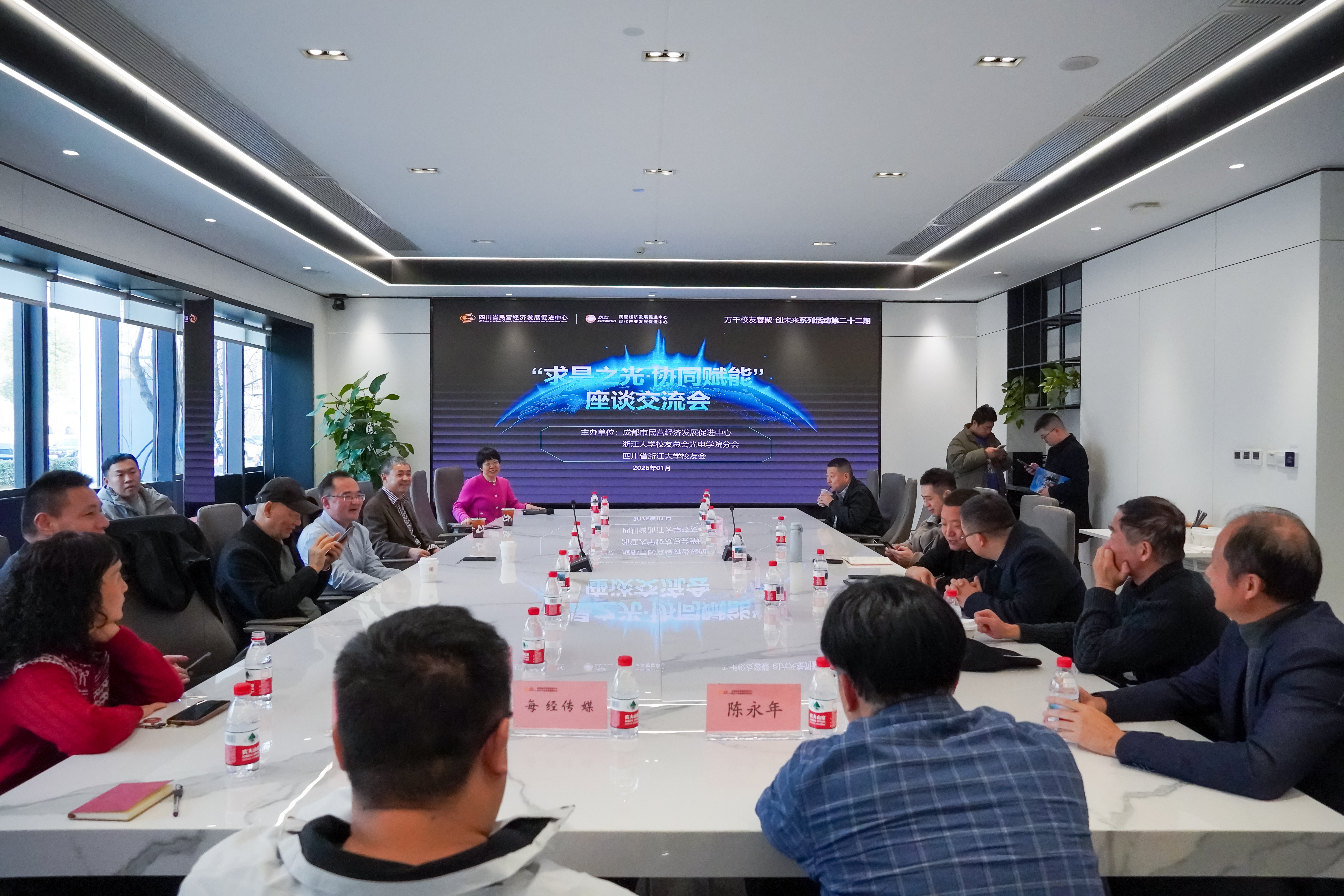 座谈会现场氛围热烈而融洽,不时响起热烈的掌声。20 多位来自科研院所、企事业等不同领域的院友们,从深耕科研一线的学术带头人,到执掌企业发展的行业精英,尽管职业赛道不同,但大家身上那份浙大人特有的严谨务实、坚韧不拔的精神特质一脉相承。共忆求是岁月、分享成长心得,大家纷纷表达了对母校、母院的深厚眷恋和感恩之情。同时,围绕光电领域的前沿技术动态、产学研协同创新机制、校企资源共享平台建设等话题,与会院友进行了深入而务实的交流,并为学院“十五五”乃至更长期的未来发展提出了很多建设性意见和建议。座谈活动得到了成都市民营经济发展促进中心、工商银行、成都人才发展促进会、成都金融联合会、成都每经传媒、成都商报等单位的大力支持。